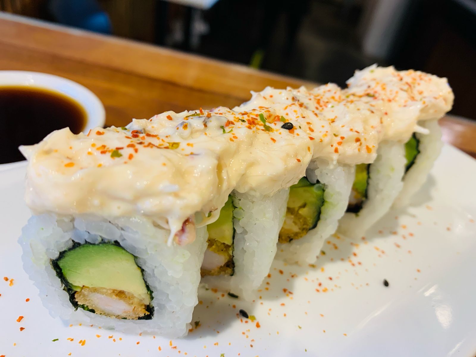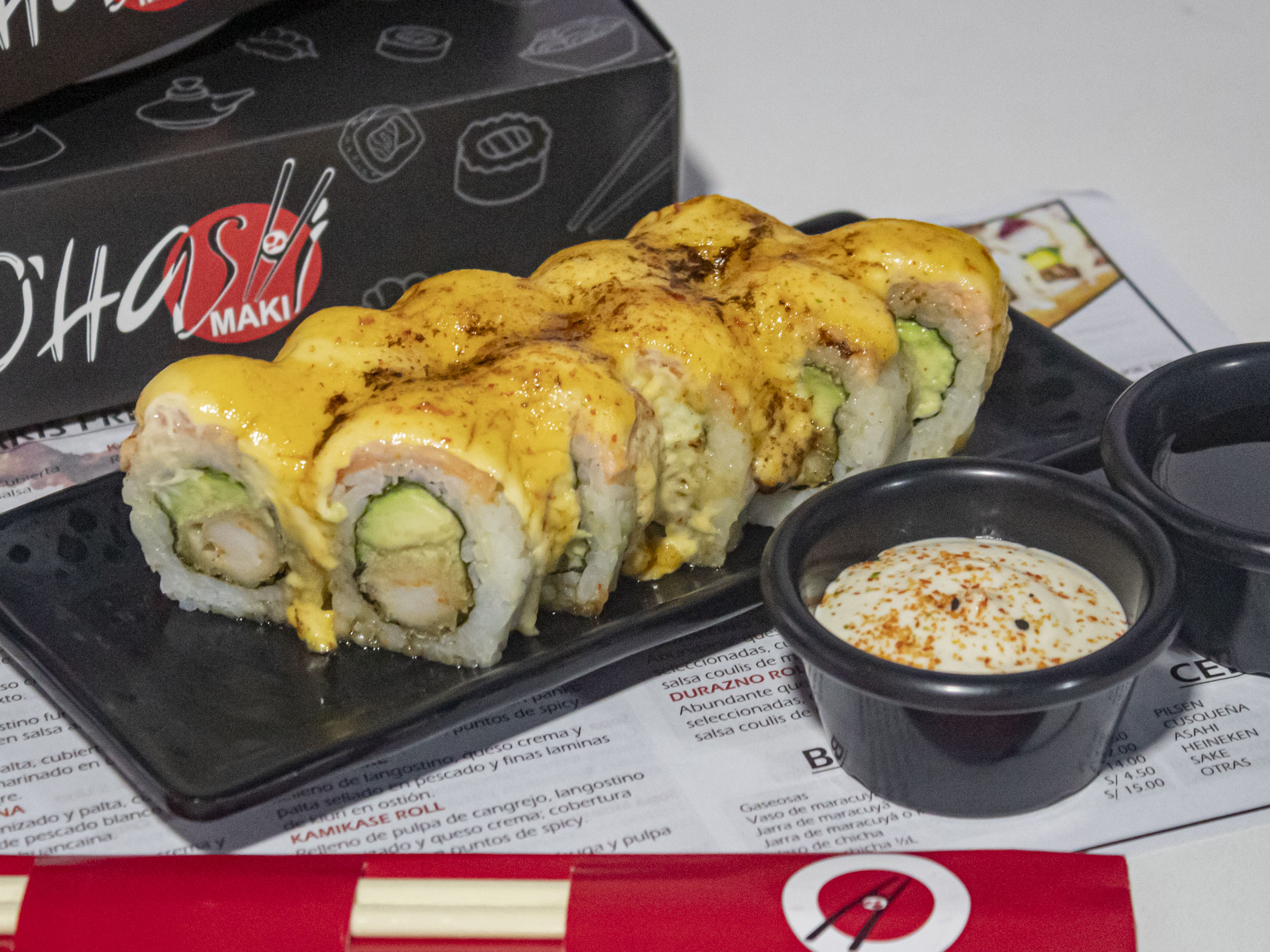 Relleno de langostino empanizado y palta, cobertura de pulpa de cangrejo en salsa acevichada.