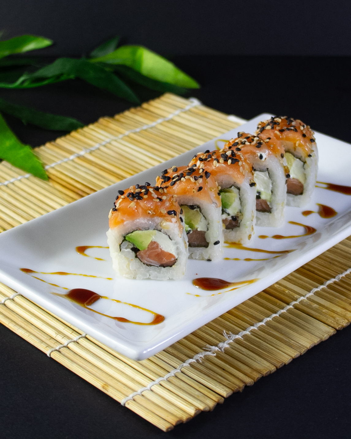 Relleno de queso crema, salmón, palta y espinaca, cobertura de salmón bañado en salsa.