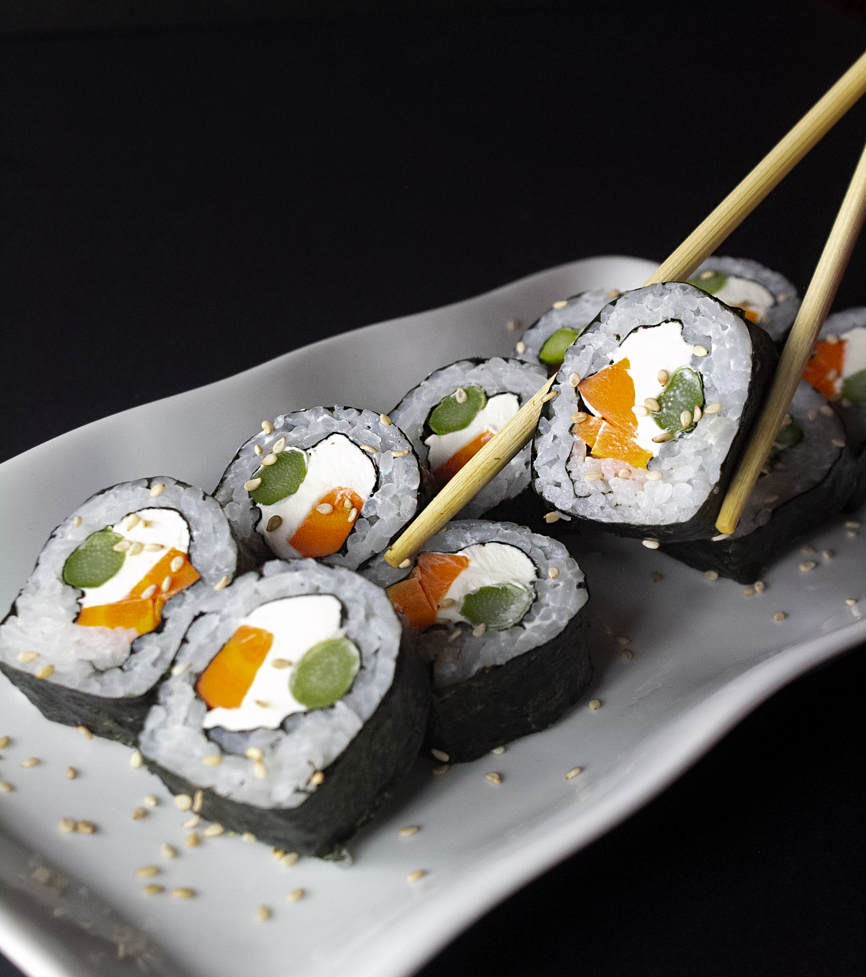 Langostino cocido, queso crema y palta, cubierto de ajonjolí mixto.