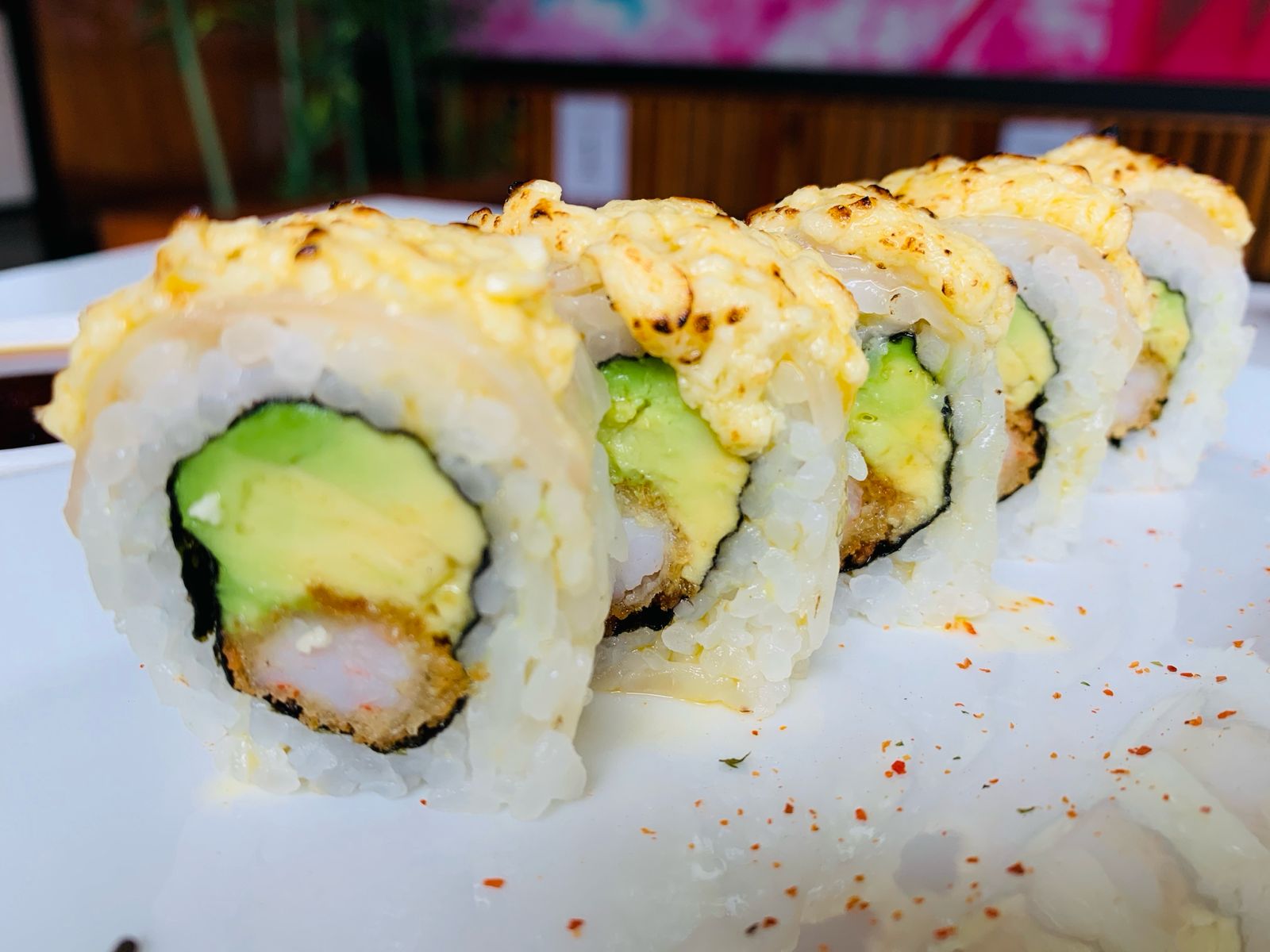 Langostino empanizado y palta, cubierto de salmón flameado en una salsa ligeramente dulce y togarashi.
