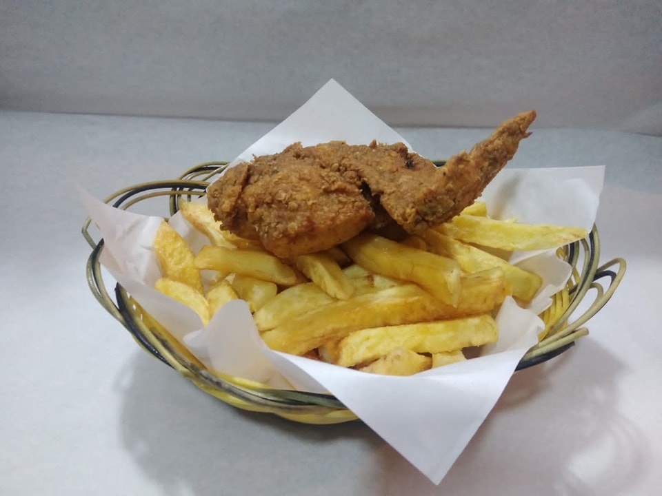 Pierna con cremas acompañado de abundantes papas fritas.