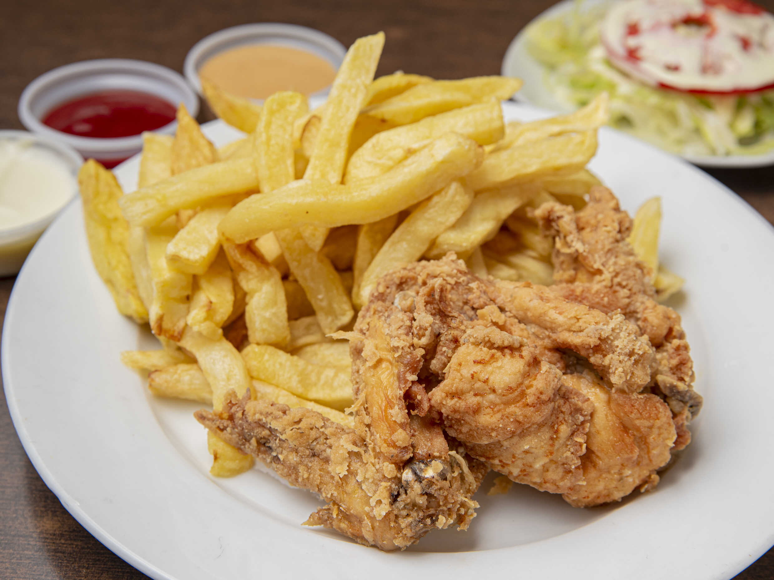 Crujiente alita, papas, cremas y ensalada.