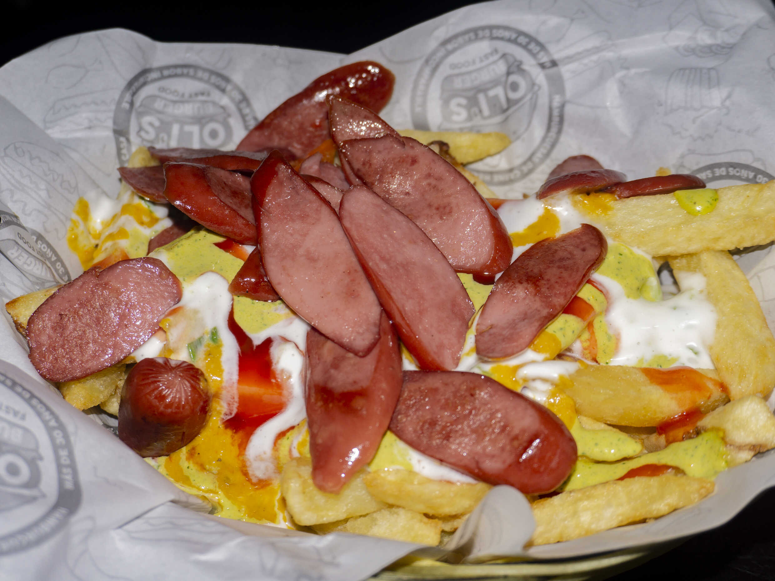 Chorizo, hot dog, huevo crujiente, papas fritas y cremas a elección.