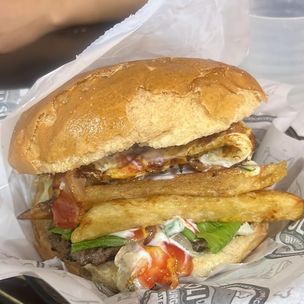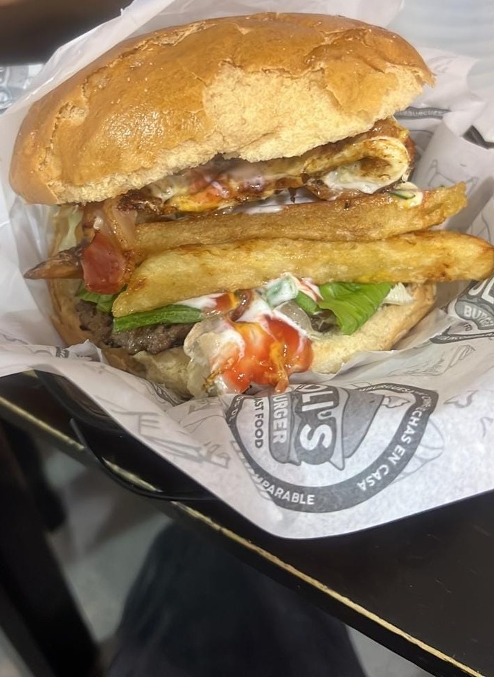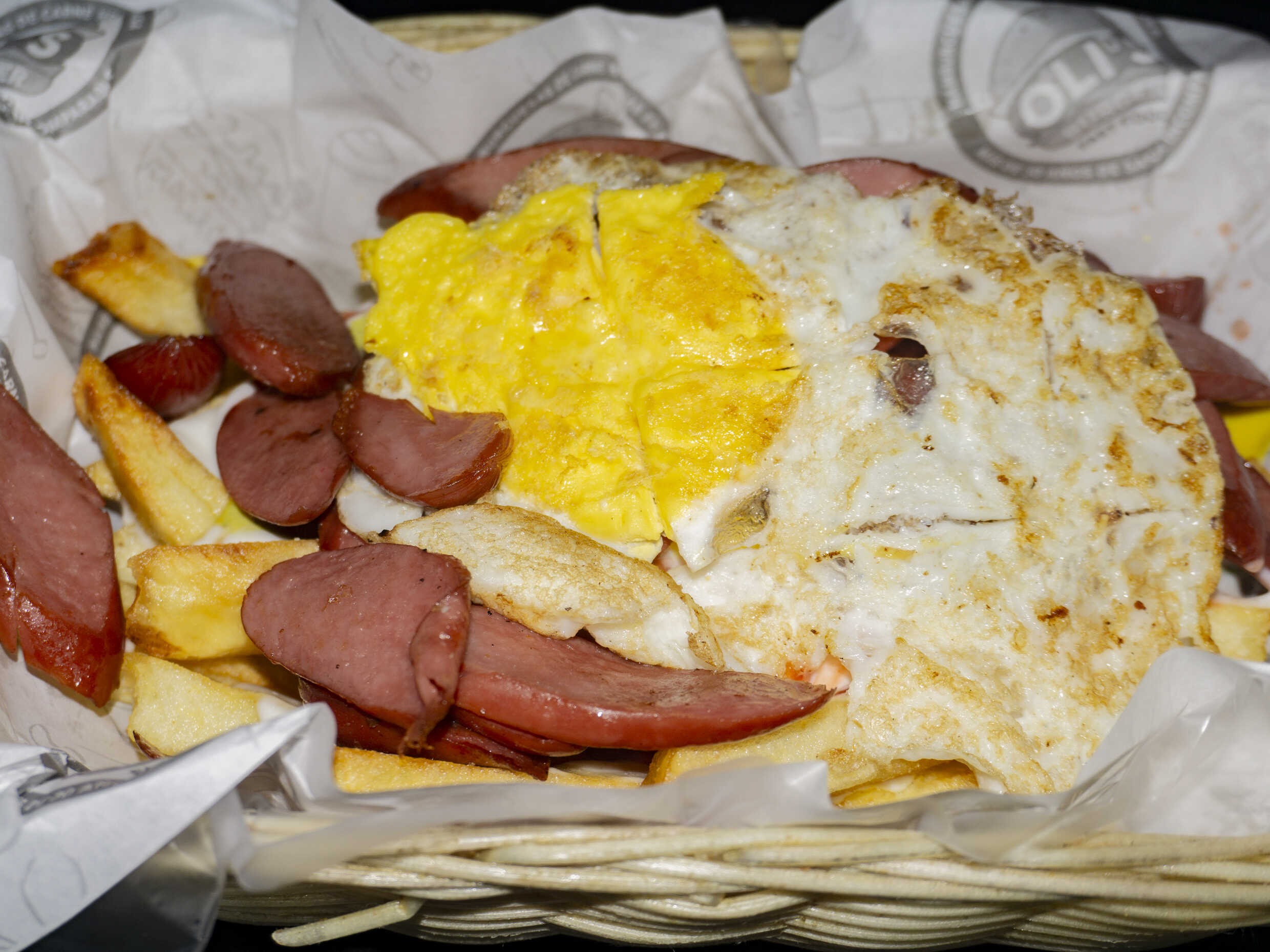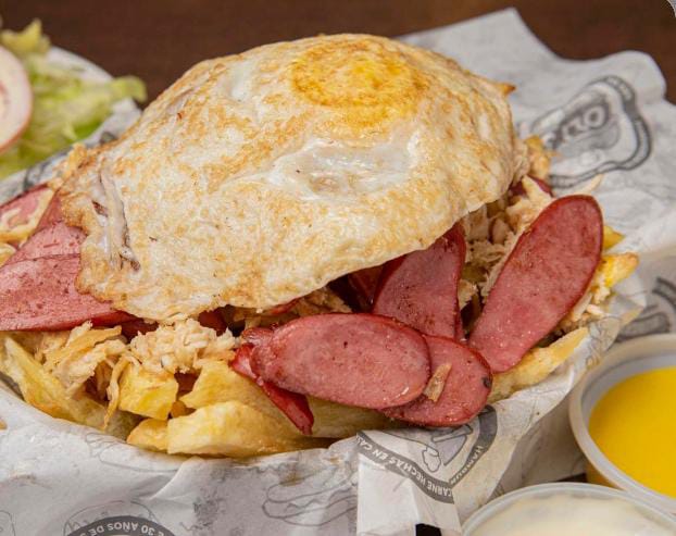 Chorizo, queso, huevo, cremas a elección acompañado de abundantes papas fritas.