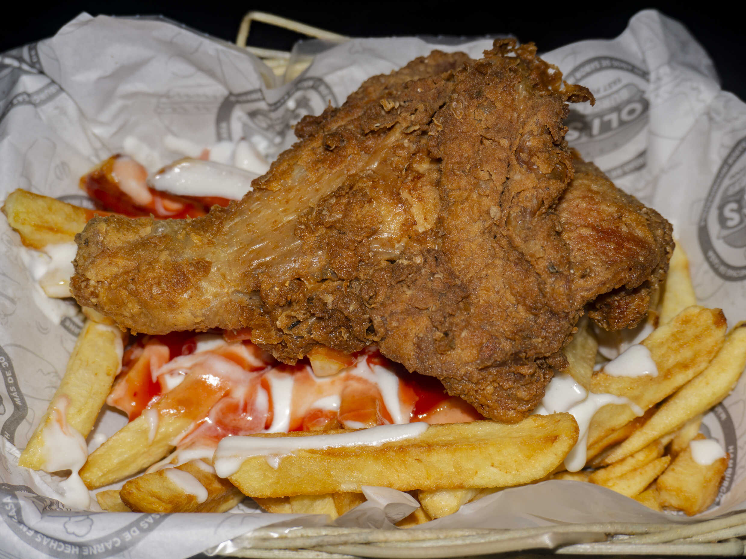 Pollo, queso, huevo con cremas y abundantes papas fritas.