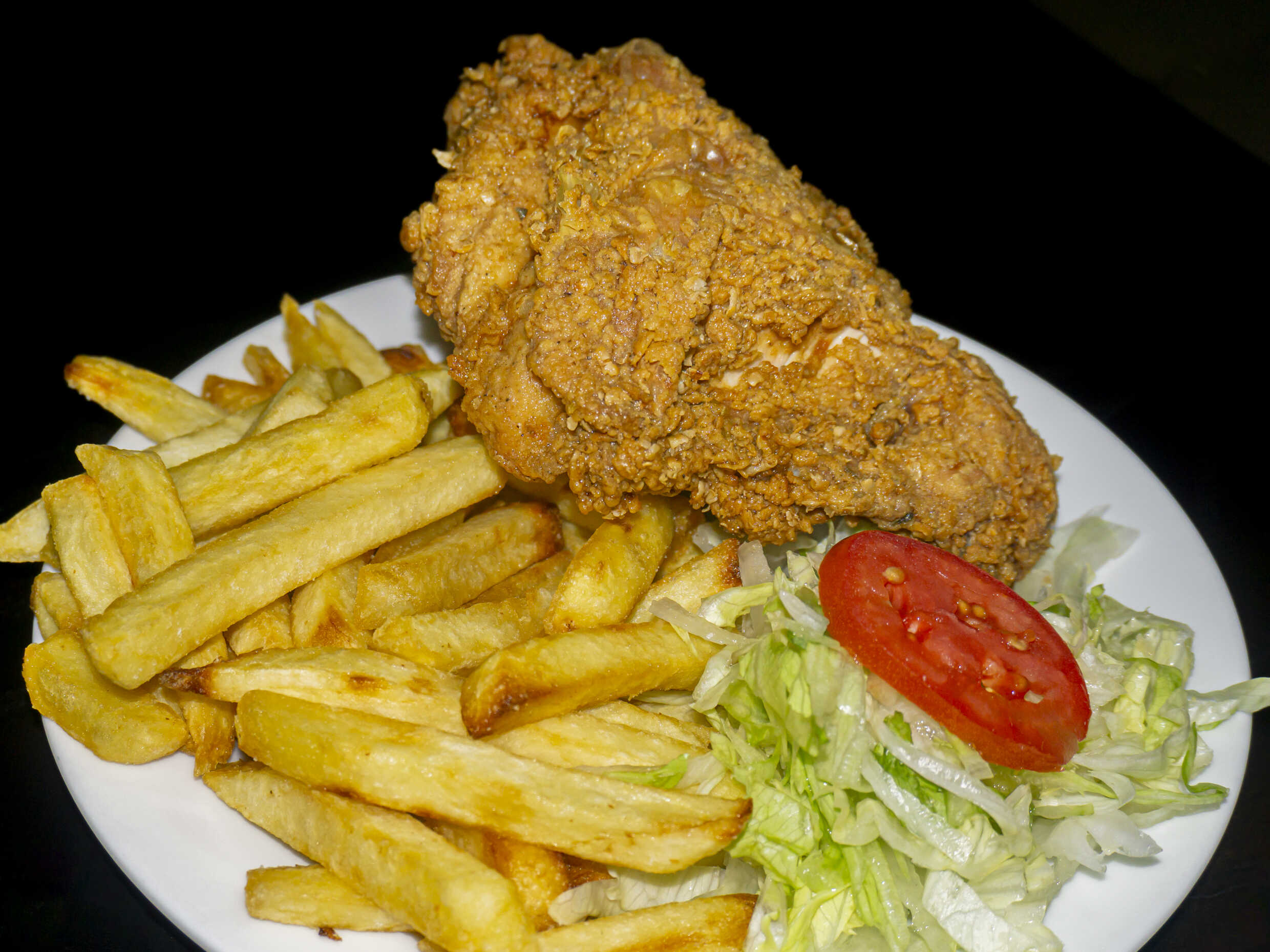 Crujiente pierna especial, papas, cremas y ensalada.