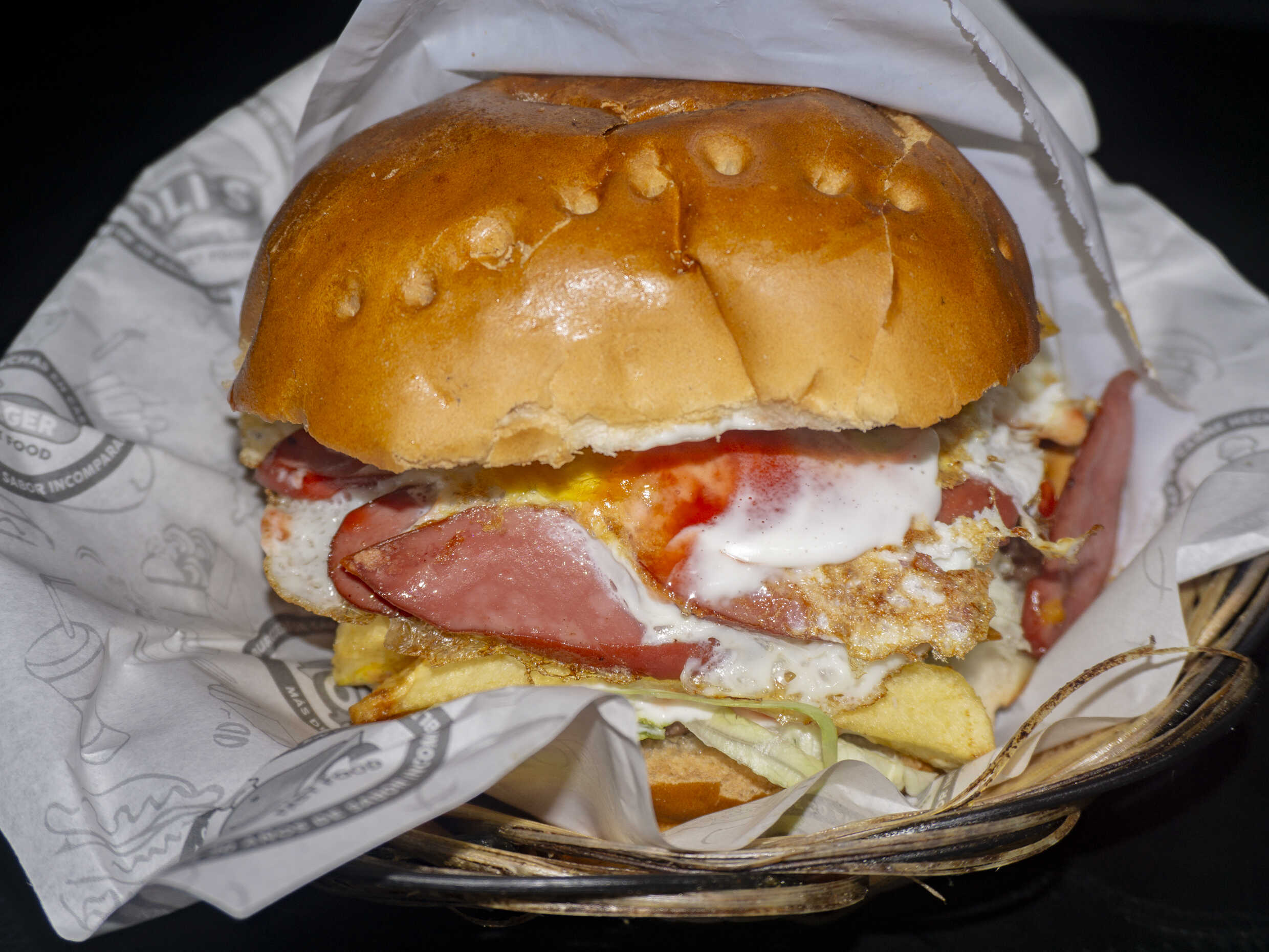 Hamburguesa de carne hotdog , huevo con cremas, acompañado de abundantes papas fritas.