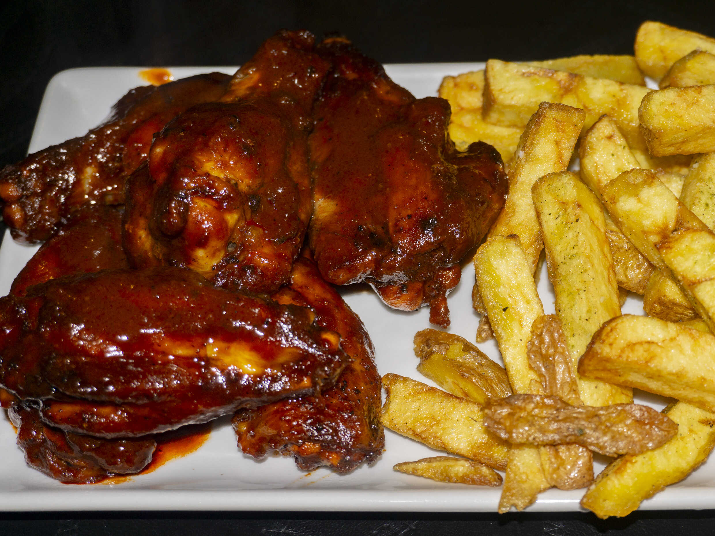 6 unidades de alitas en salsa BBQ picante acompañado de papas nativas