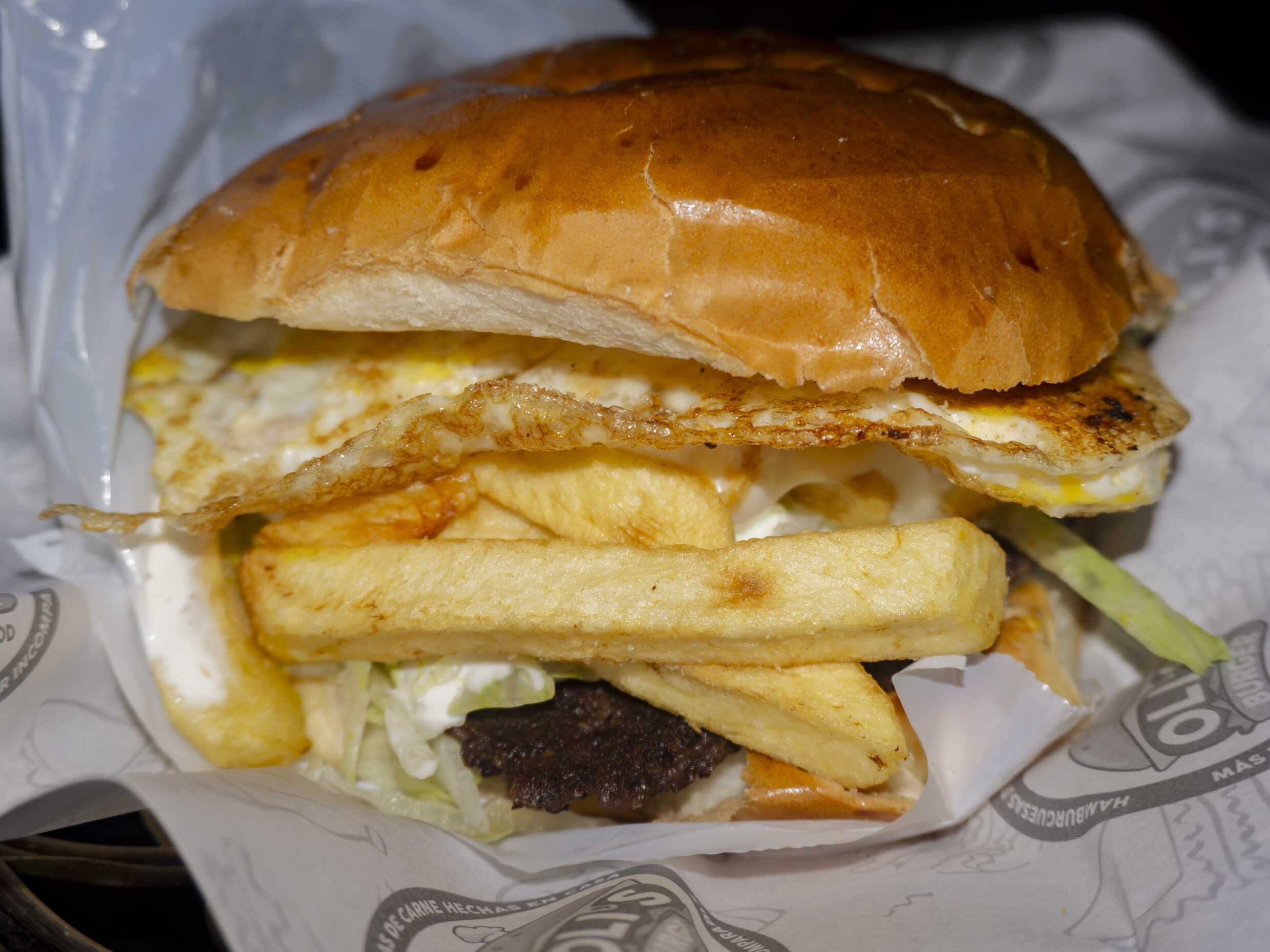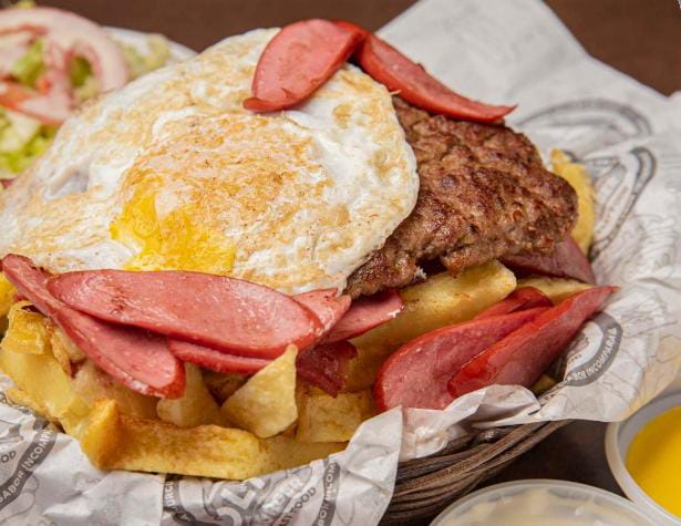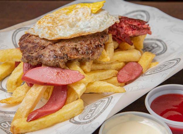 Carne, queso, huevo con cremas y abundantes papas fritas.