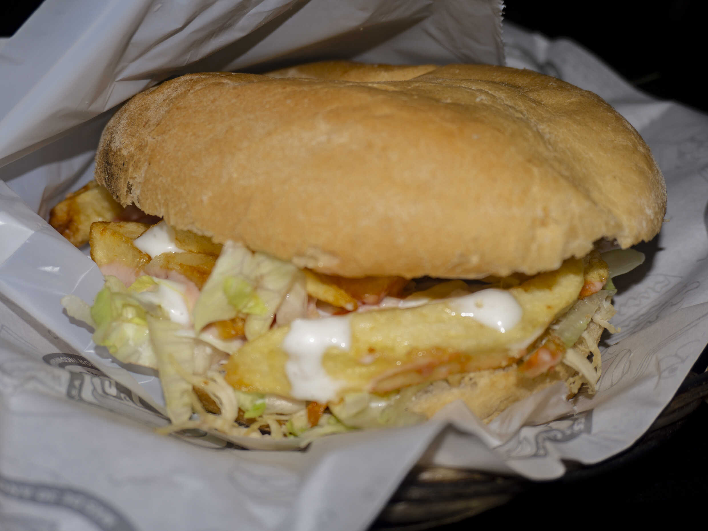 Filete, queso, huevo con cremas a elección acompañado de abundantes papas fritas.