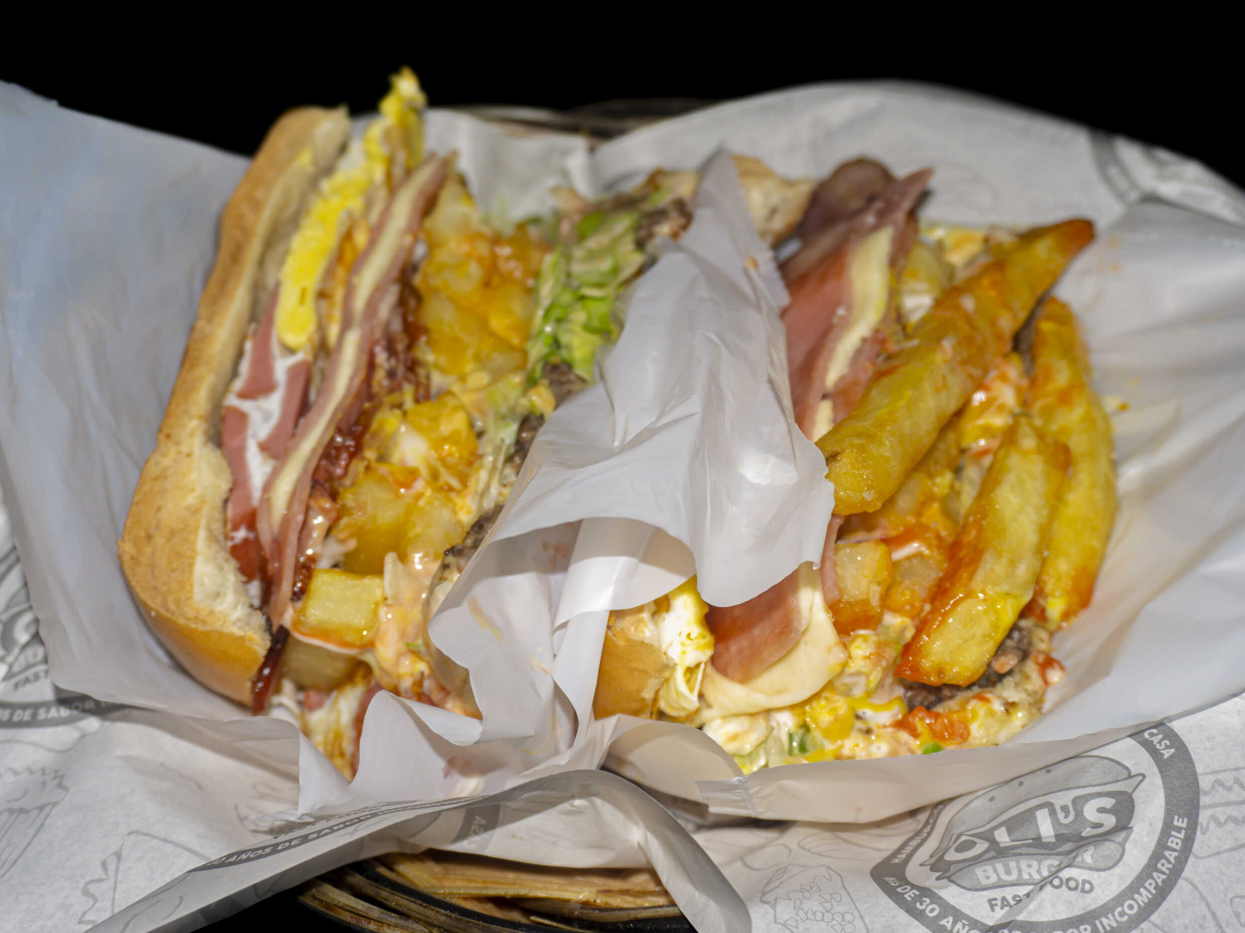Carne, hot dog, huevo, tocino, queso, jamón con cremas y abundantes papas fritas.