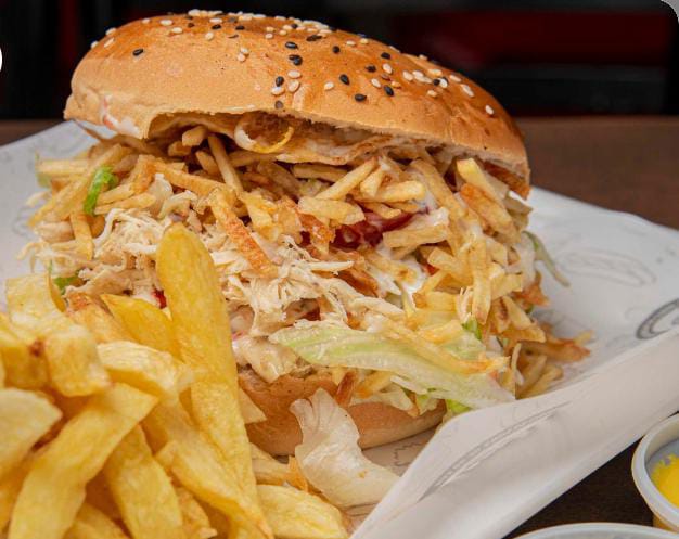 Pollo desmenuzado , chorizo finas hierbas cremas y abundantes papas fritas