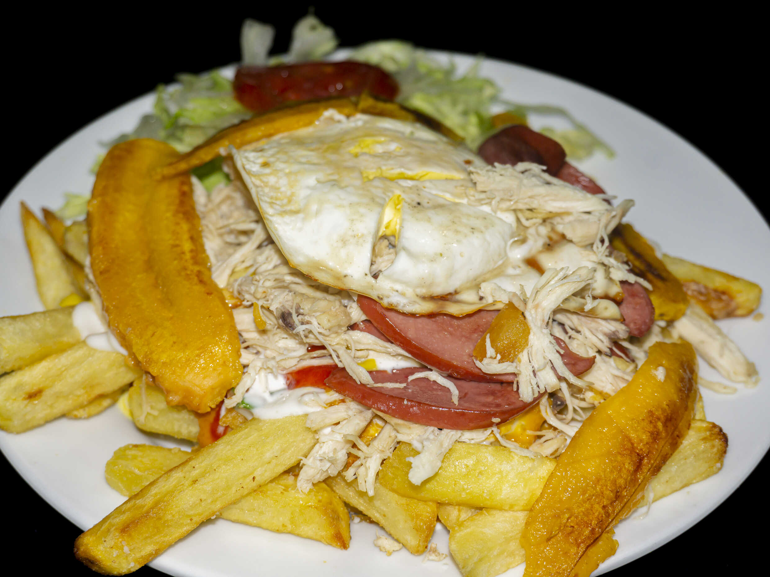 Chorizo, jamón, huevo, cremas a elección acompañado de abundantes papas fritas.