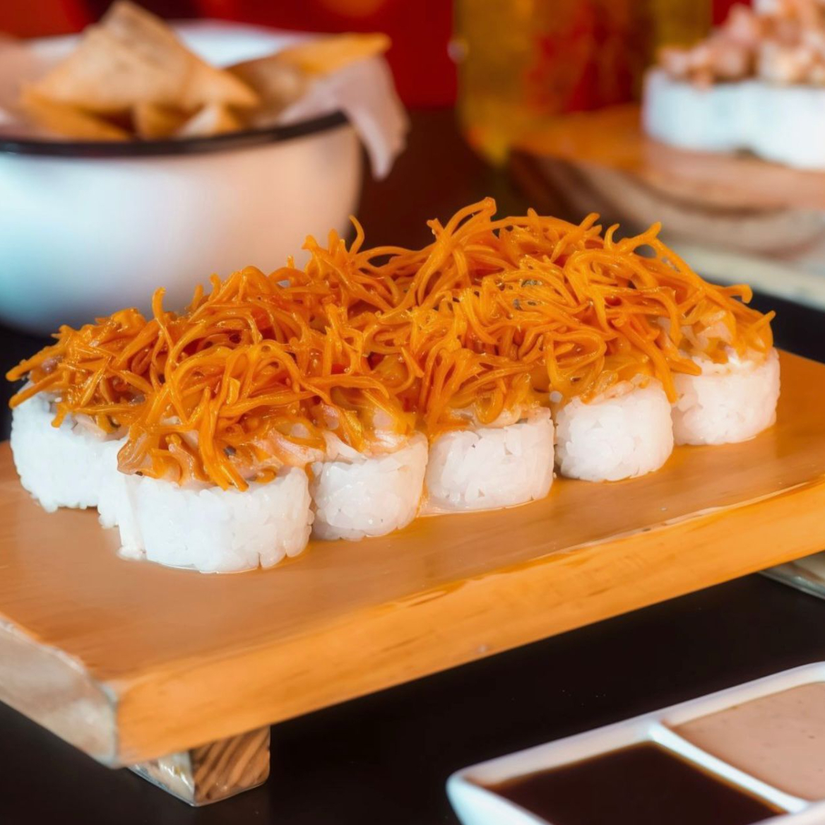 Maki de pescado furai y palta, cubierto con chicharrón de mariscos en salsa de rocoto e hilos de camote, 10 cortes.
