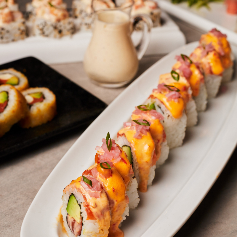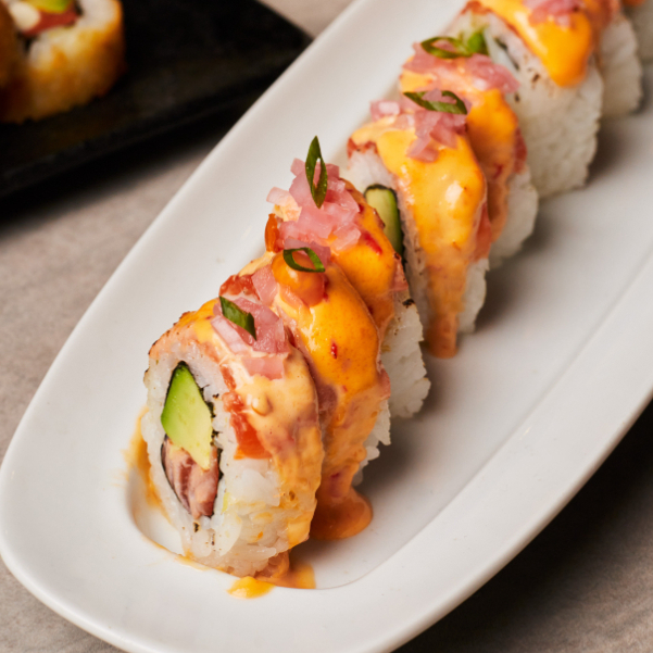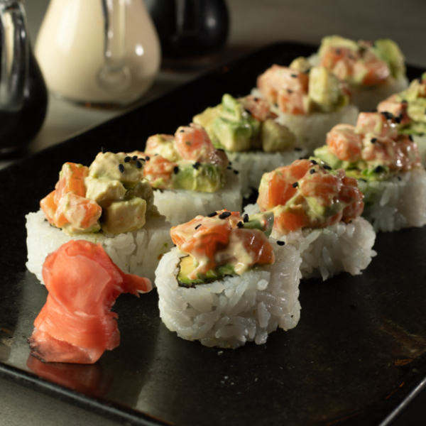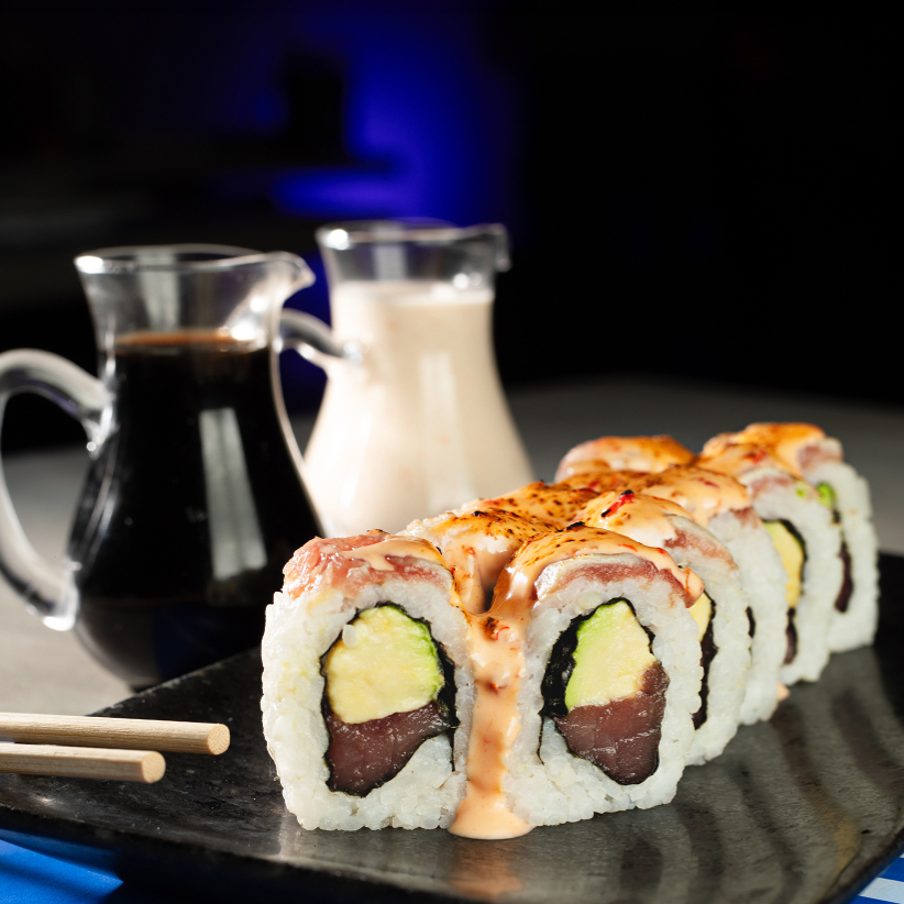 Maki de tartar de atún spicy y palta, cubierto de láminas de atún y salsa spicy flameada, 10 cortes.