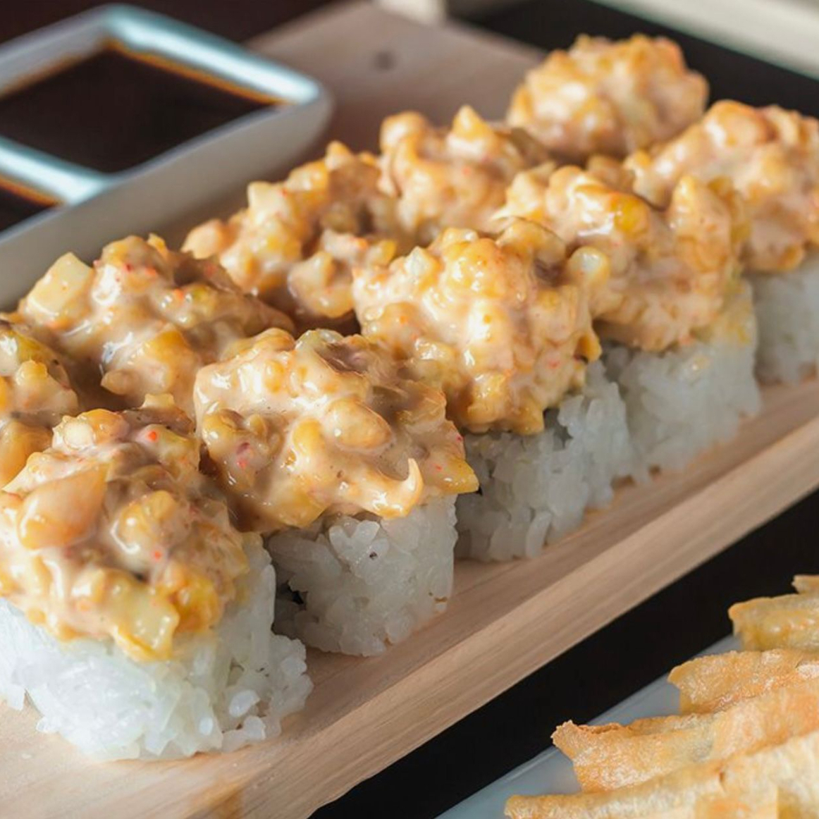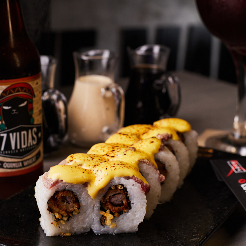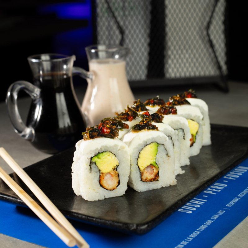 Maki de pescado furai y palta, cubierto con chicharrón de mariscos en salsa acevichada 10 cortes.