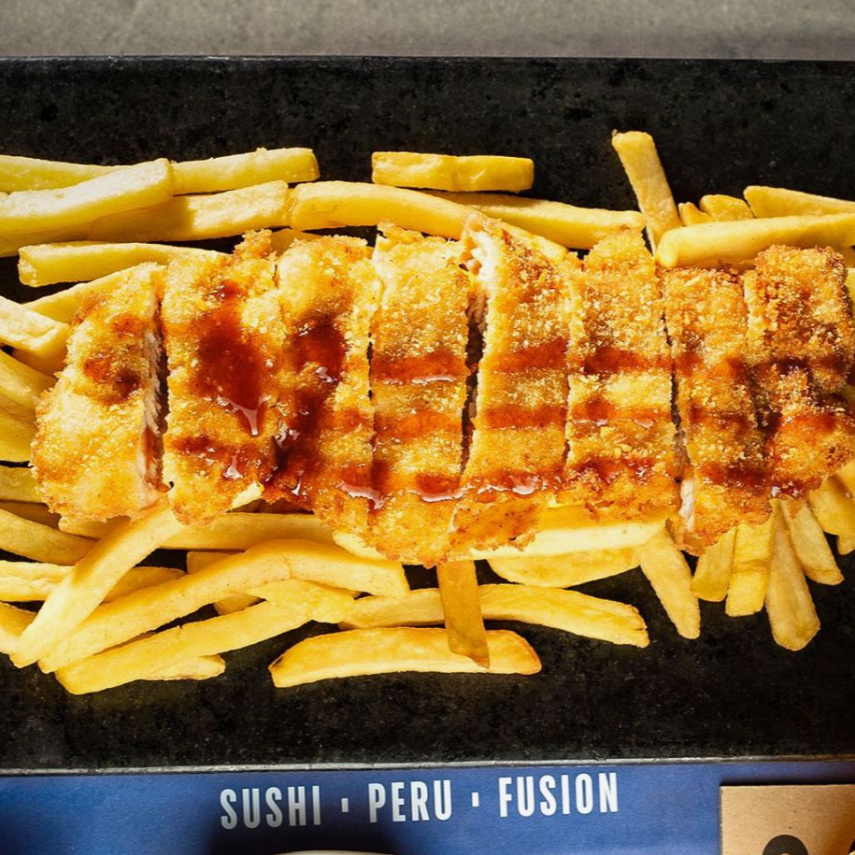 500 g De costillas de cerdo bañadas en nuestra salsa BBQ nikkei, servidas con papas fritas, ensalada de zanahoria y col.