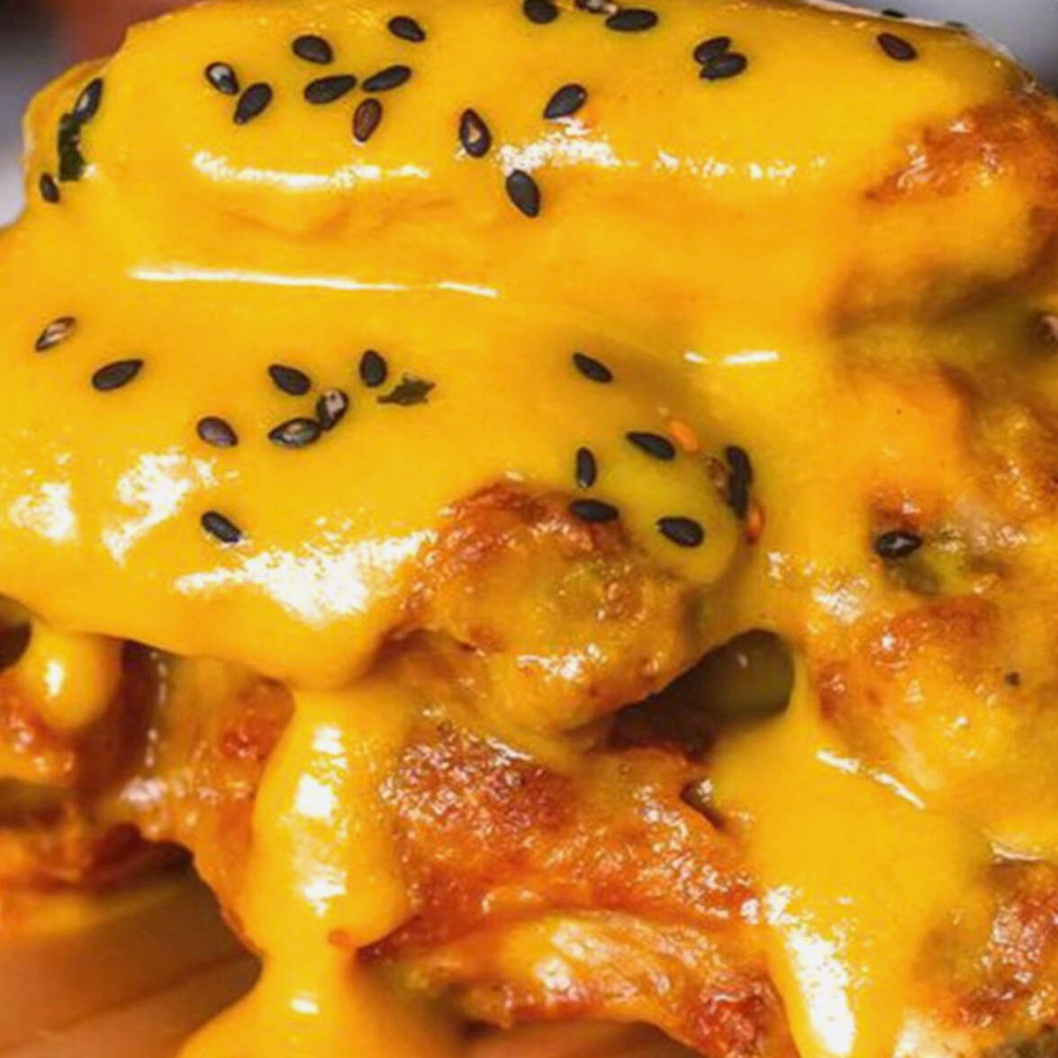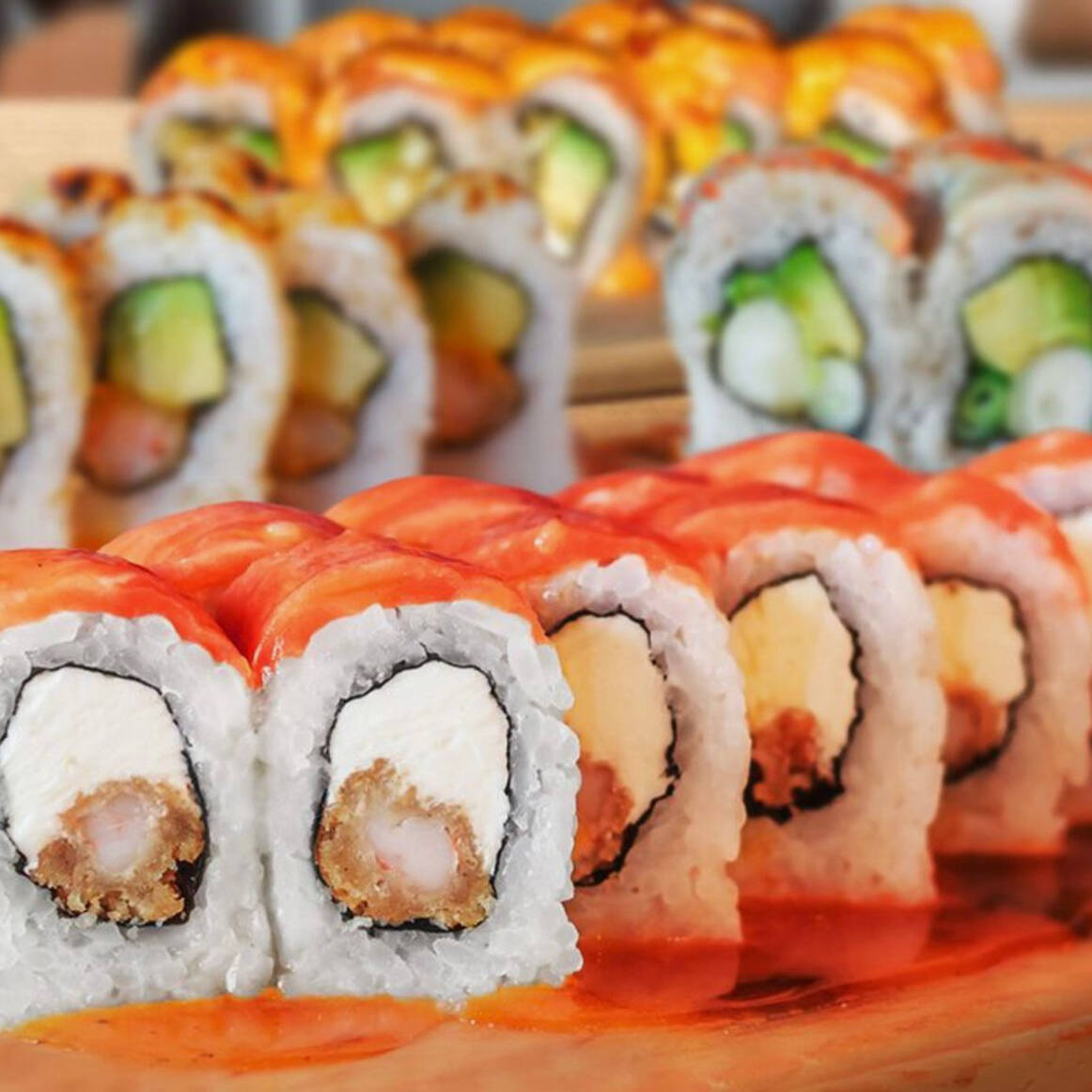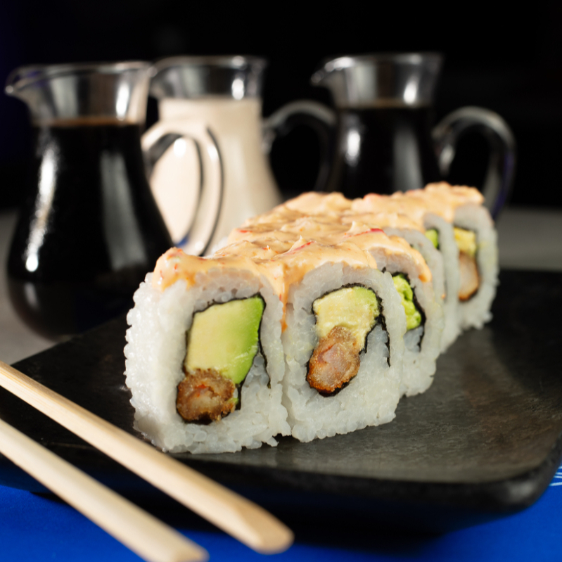 Maki de langostino furai y palta, cubierto salsa de ajos picantes y queso crema gratinada, 10 cortes.