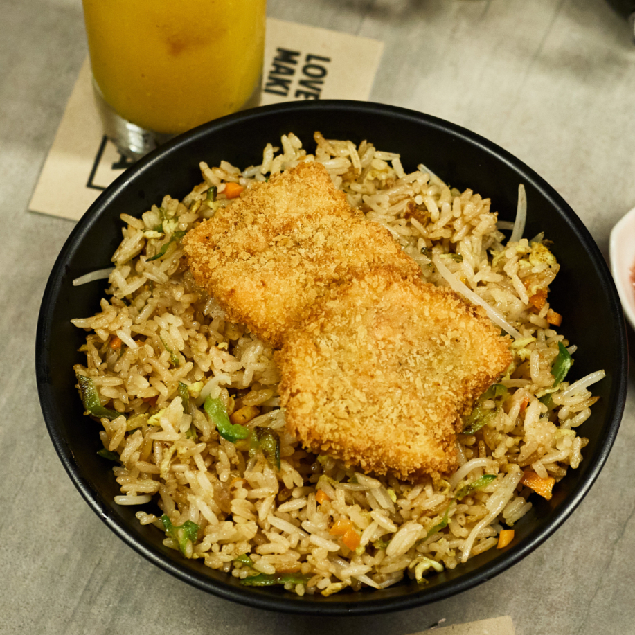 Arroz frito con frejol chino, holantao, huevo, zanahoria y pecanas. Pídelo con pollo, trucha o langostinos al panko.