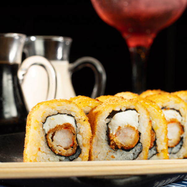 Makis de langostinos furai y queso crema. Empanizado por fuera y servido con salsa Honey Mustard. 10 cortes.