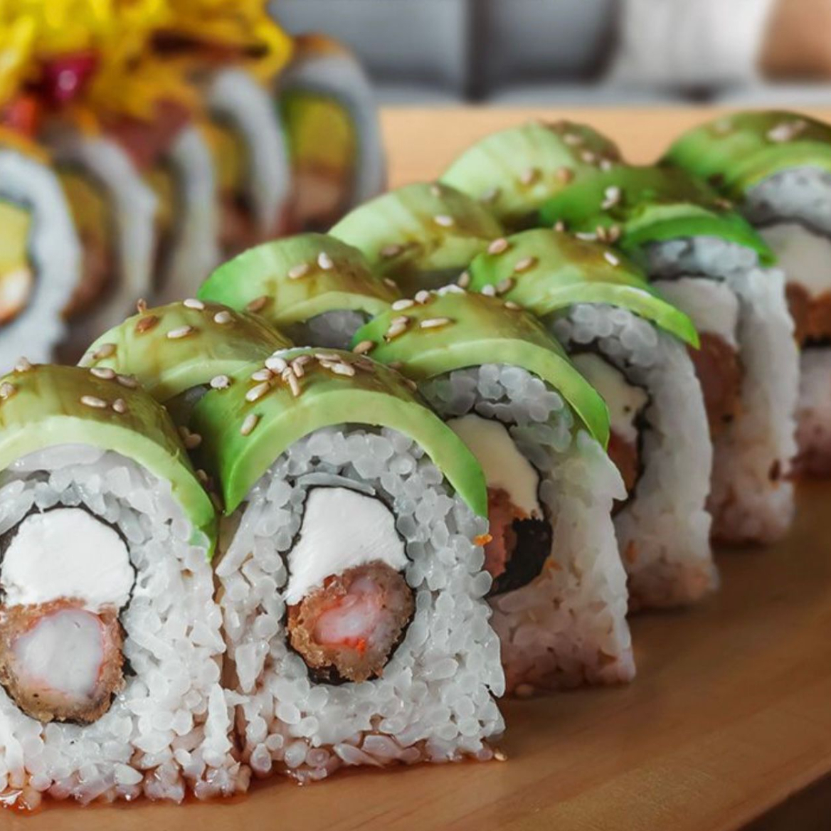 Maki de pescado furai, lechuga y queso crema, cubierta flameada de atún en chimichurri, 10 cortes.