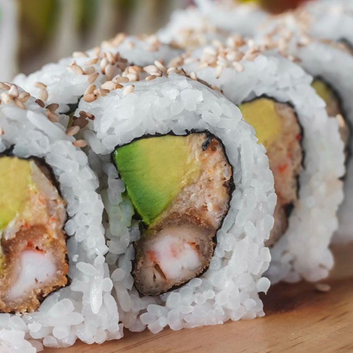 Maki de langostinos furai, pulpa de cangrejo y palta, cubierto de ajonjolí tostado, 10 cortes.