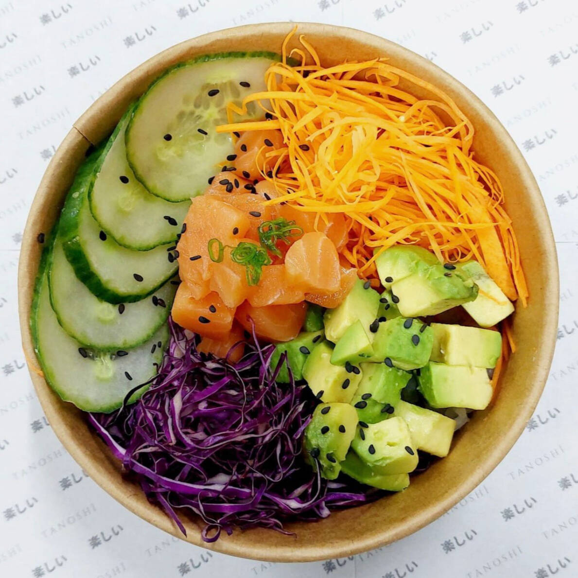 Tu poke con base de arroz (shari), salmón, zanahoria, kiuri, col morada, palta y toques de quinua negra, servido con salsa thai.
