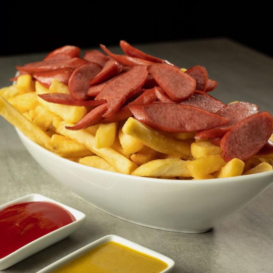 Salchicha frankfurt con papas fritas.