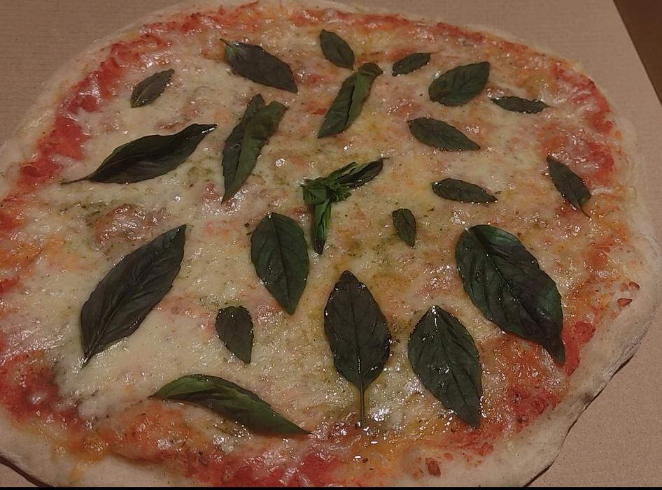 Salsa pizzera, queso mozzarella y hojas de albahaca.