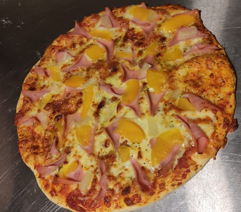 Salsa pizzera, queso mozzarella, jamón, durazno y piña.