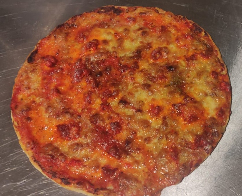 Salsa pizzera, queso mozzarella, carne guisada, champiñones y chorizo.