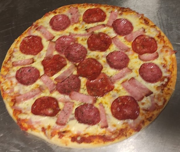 Salsa pizzera, queso mozzarella, pepperoni, salchicha, pimiento y aceituna verde.