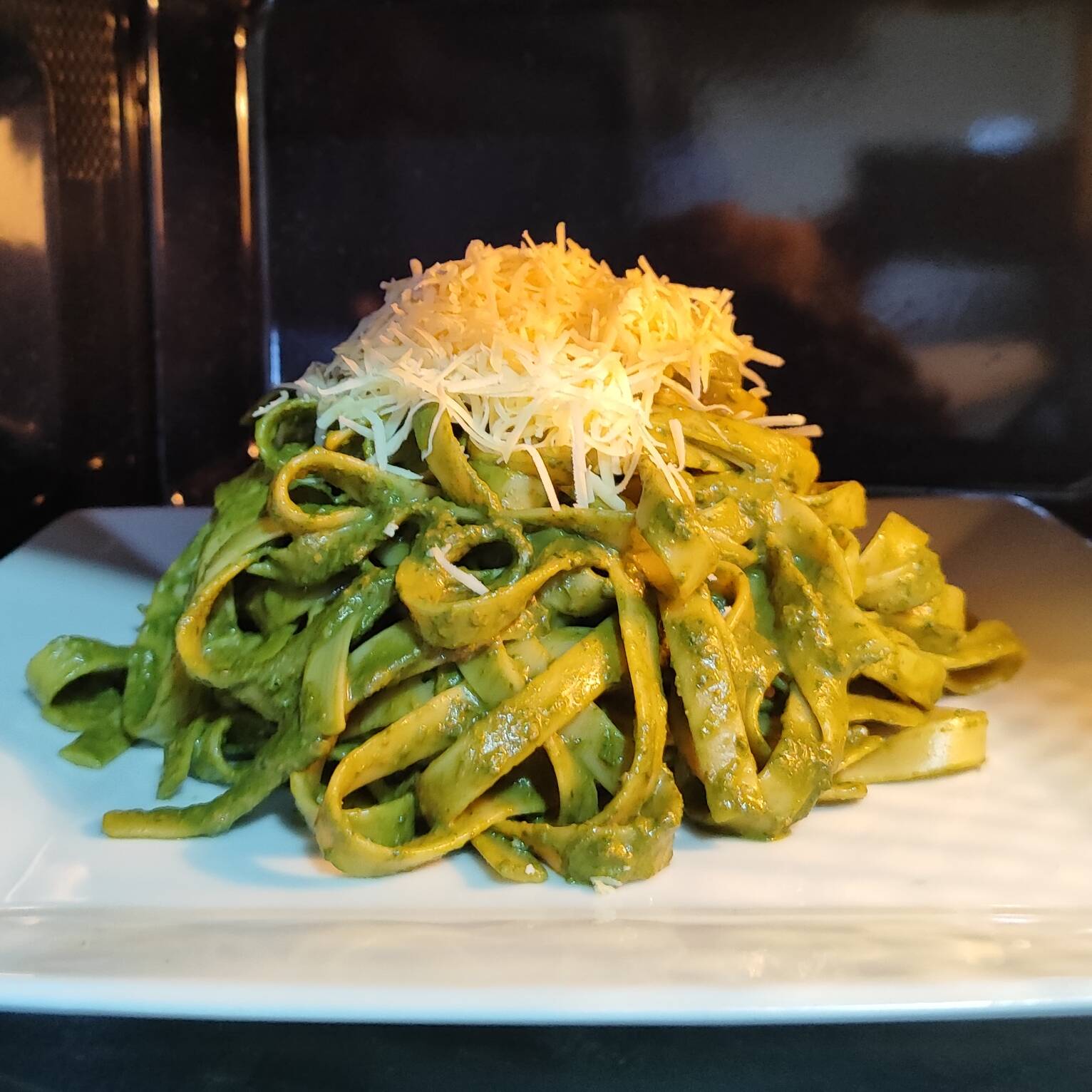 Salsa al pesto, albahaca, frutos mediterraneos, queso parmesano y pasta al huevo