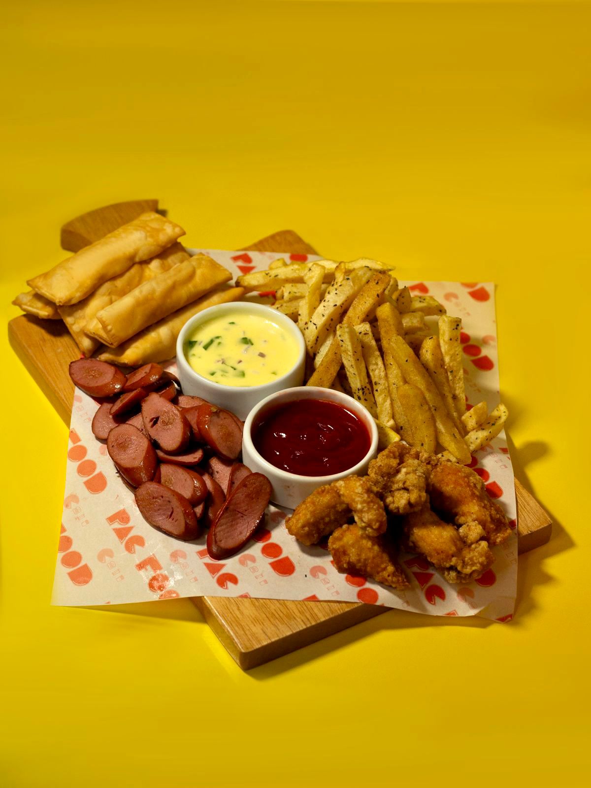 Cinco tequeños de queso con porción de Crunch Broaster, papas fritas, hot dog y cremas.