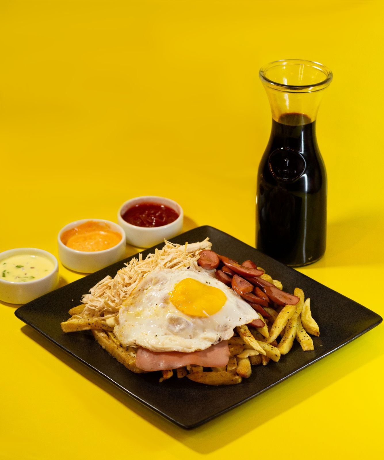 Pollo deshilachado con queso, jamón y huevo, ensalada y papas al hilo.