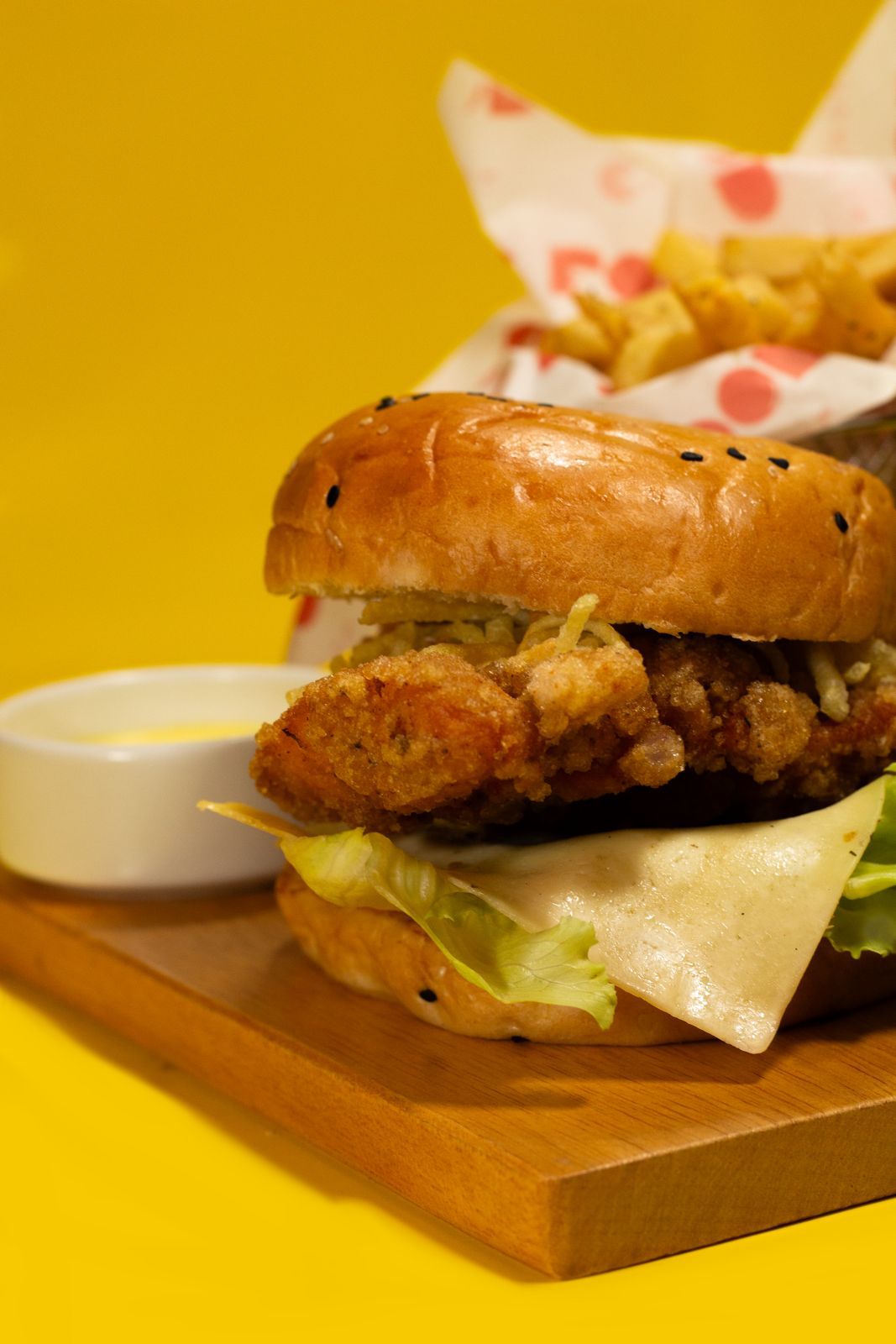 Filete de pollo empanizado con la receta de la casa, queso y lechuga, acompañado de papas fritas.