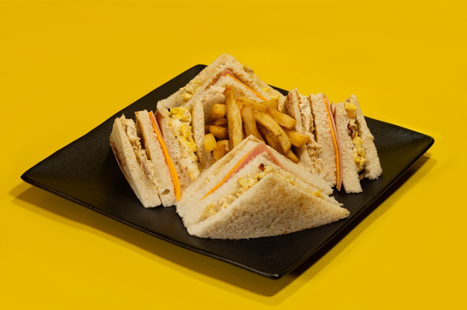 Pan de molde Pullman preparado con jamón, queso, tocino, pollo deshilachado y huevo, servido con papas fritas.