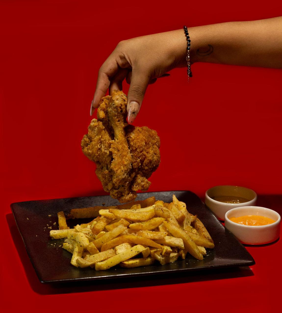 Dos alitas broaster con porción de papas fritas.
