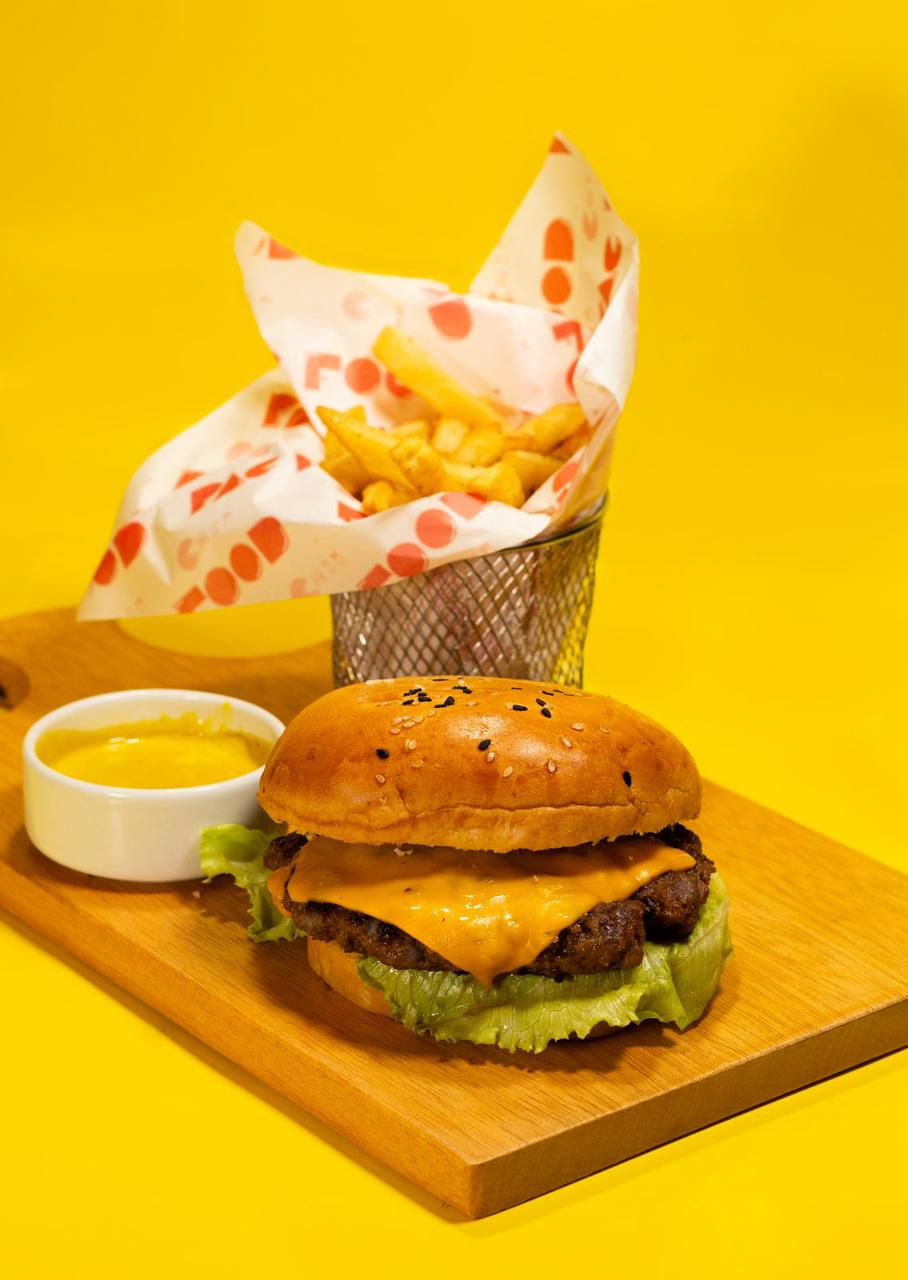 Hamburguesa con queso cheddar, lechuga y carne de 120 g, acompañada de papas fritas.