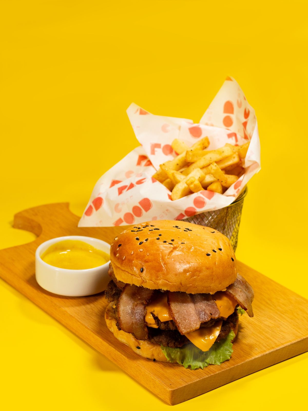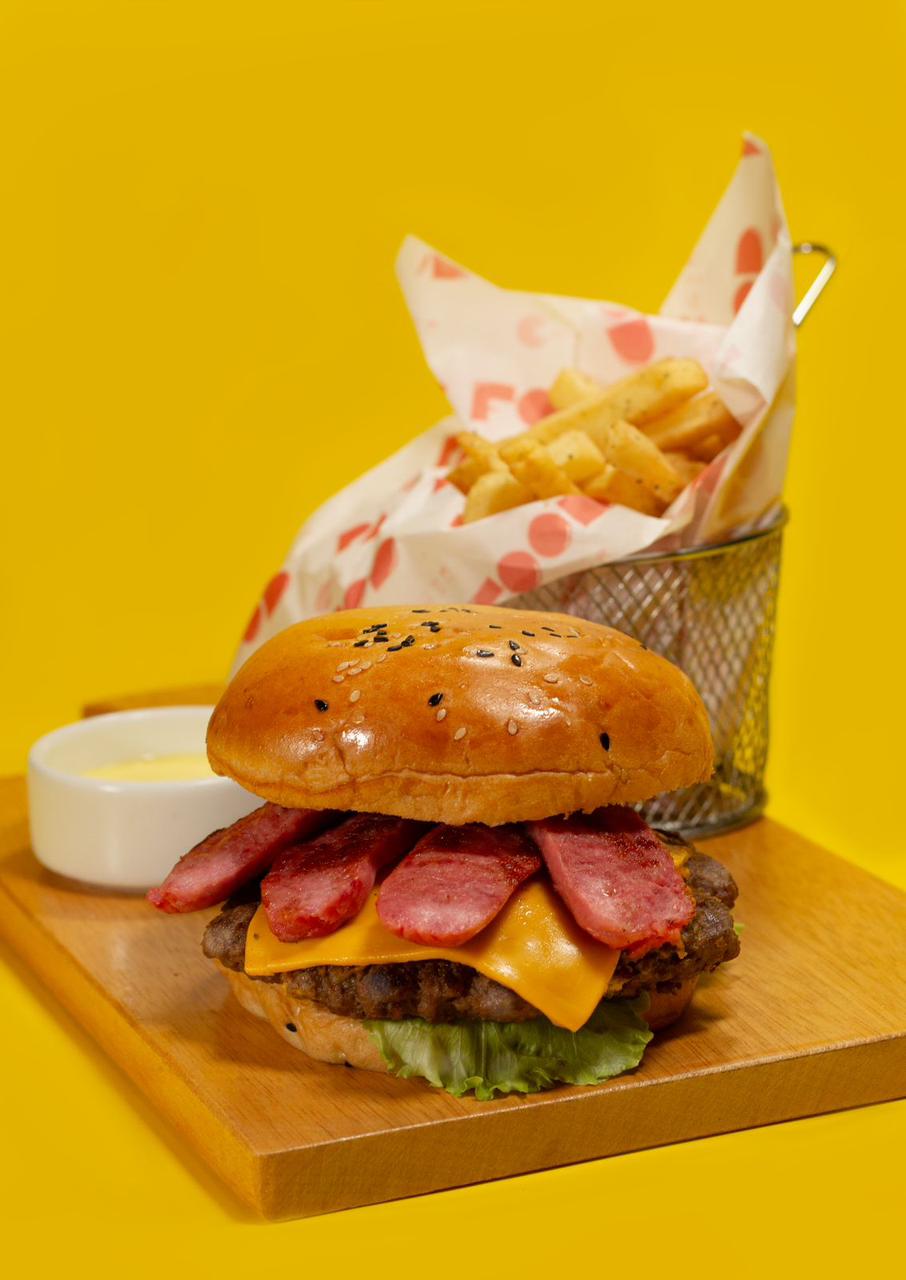 Doble carne, doble queso cheddar y tocino, acompañado de papas fritas.