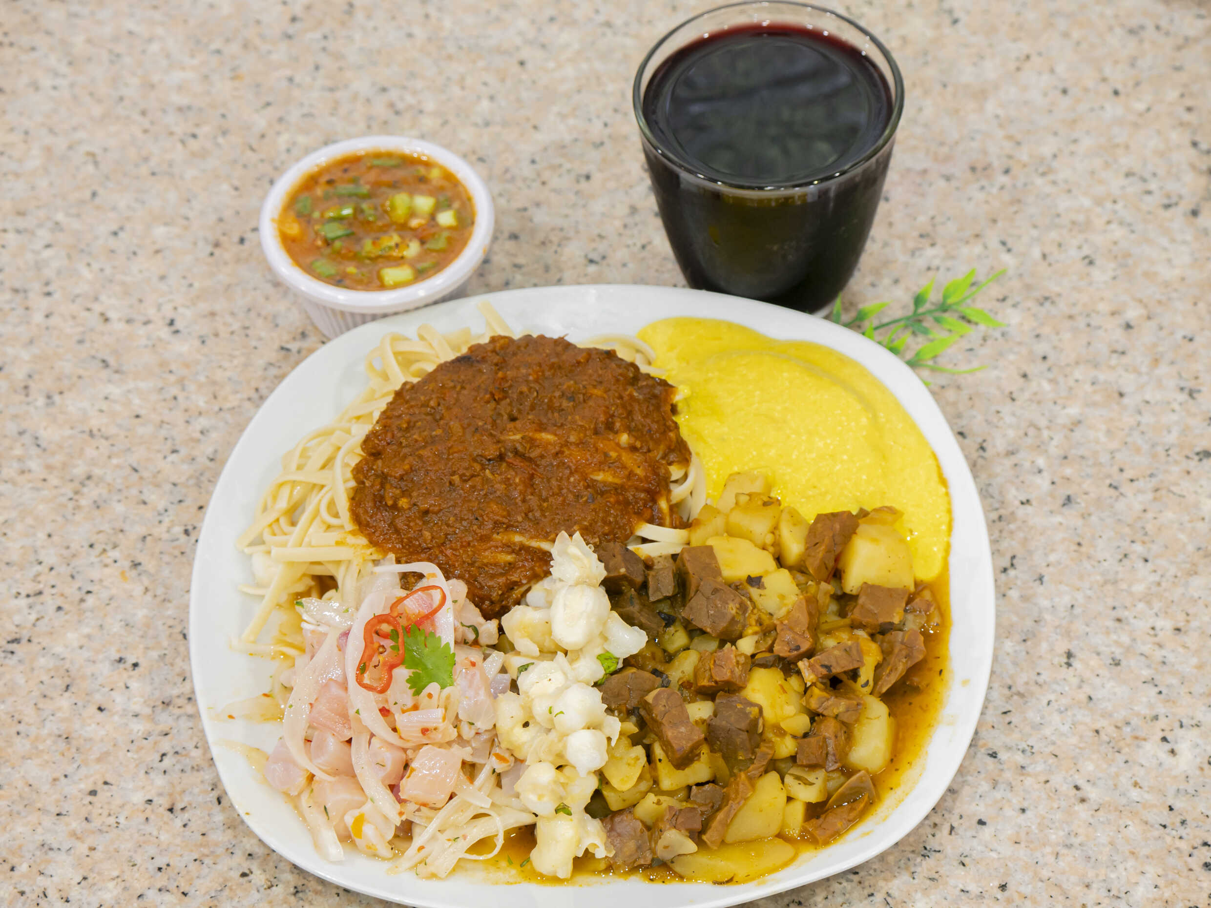 Talllarines en salsa de carne acompañado de ceviche y papa a la huancaína.