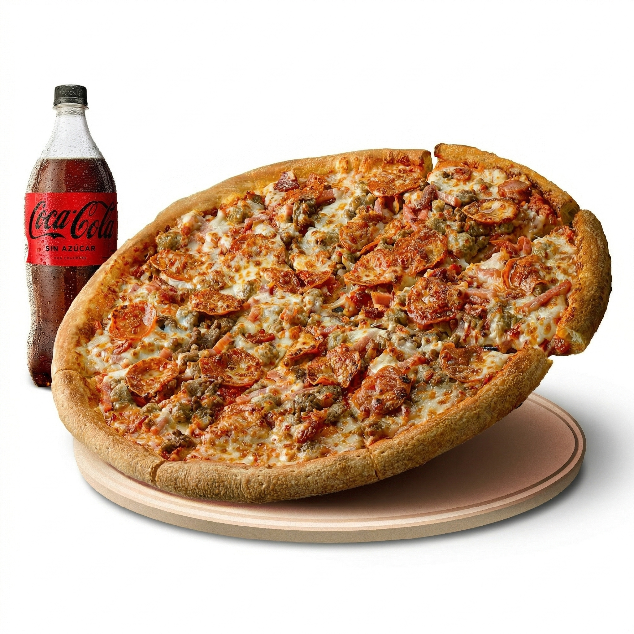 Pizza con pepperoni, salchicha de cerdo, jamon, tocino, carne de res y queso mozzarella