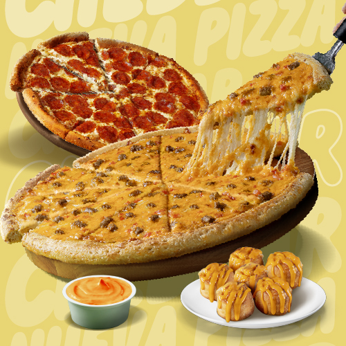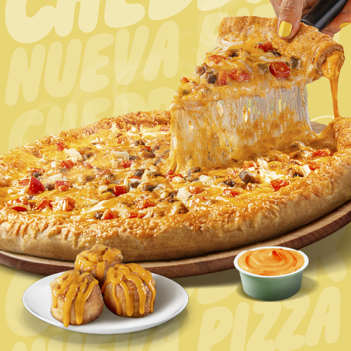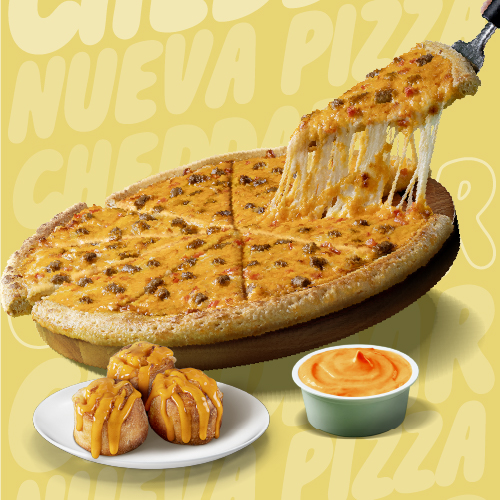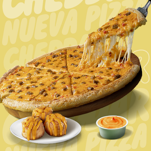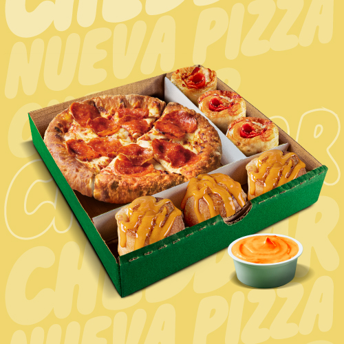 1 Cheddar Grande (Borde cheddar + S/.10) + Clasica Grande + Rolls Cheddar x6 + Cup Cheddar