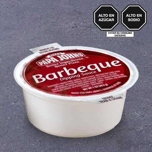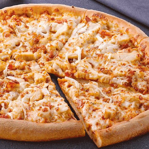 Pizza con base de salsa BBQ, pollo, tocino, cebolla blanca y queso mozzarella.