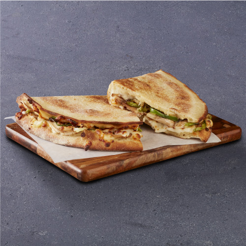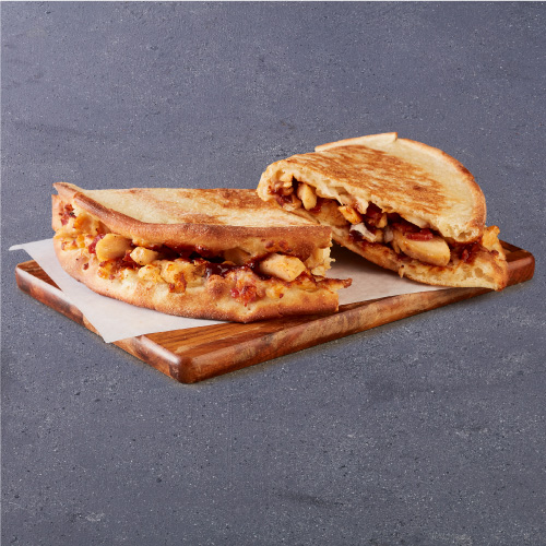 Mitad sandwich / Mitad pizza al estilo italiano, relleno de pollo, tocino, cebolla picada, mozzarella y salsa BBQ.