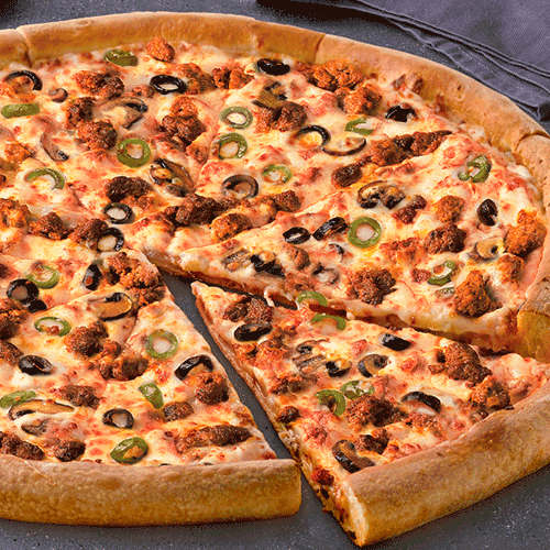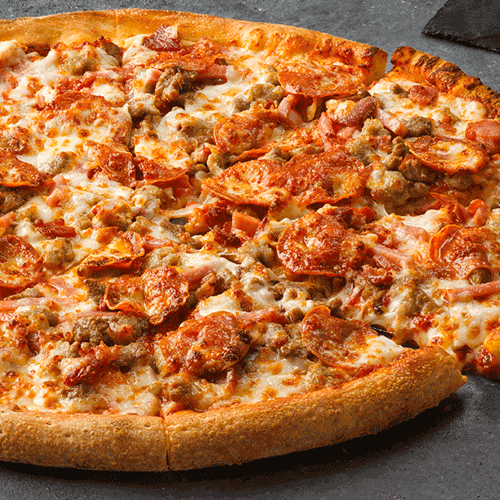 Pizza con pepperoni, salchicha de cerdo, jamón, tocino, carne de res y queso mozzarella.