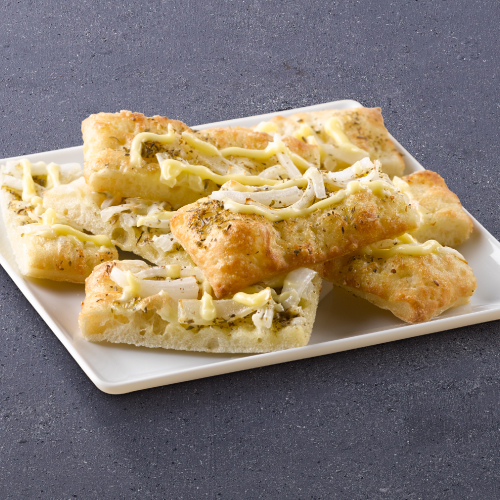 Masa recién horneada, cubierta con salsa de ajo y cebolla blanca.