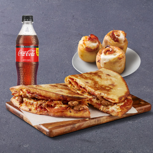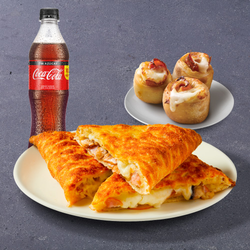 Calzone a elección, Gaseosa Personal y 3 Rolls de Pepperoni. Promoción válida del 01/09/2022 hasta el 31/12/2022, Stock mínimo de 300 unidades. No acumulable con otras promociones.