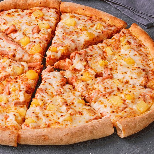 Tocino, jamón ahumado, piña, mix de quesos, queso mozzarella y sazonador italiano.