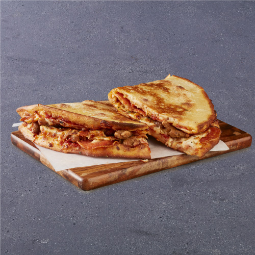 Mitad sandwich / Mitad pizza al estilo italiano, relleno de salsa de tomate, salchicha italiana, pepperoni, mozarella y orégano.